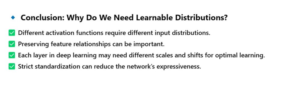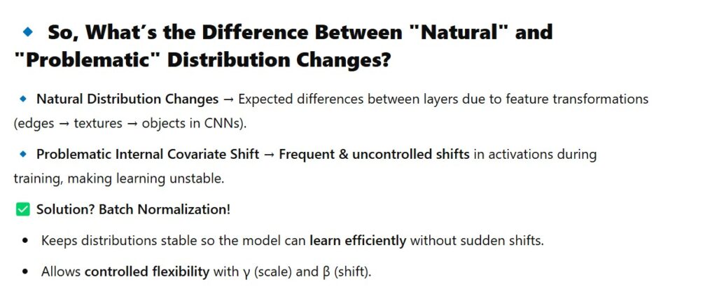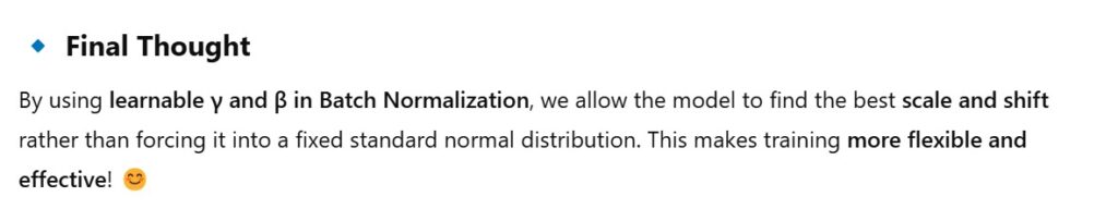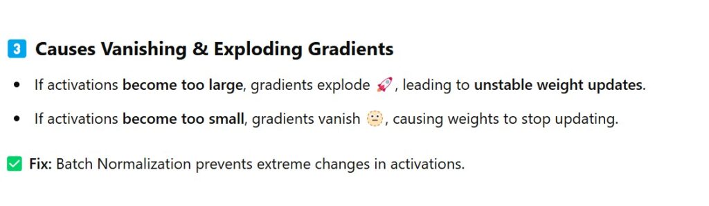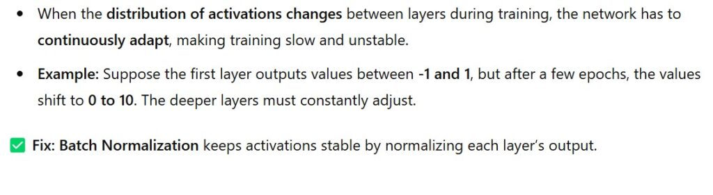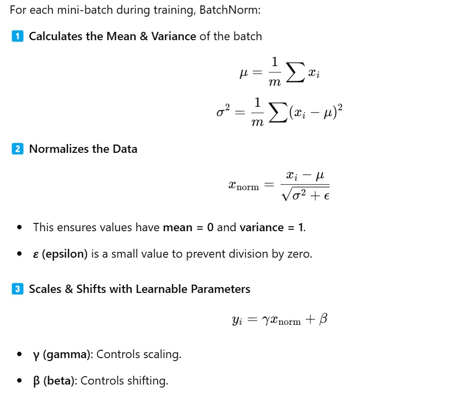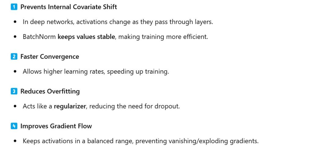 - Batch Normalization keeps activations stable by normalizing each layer’s output.