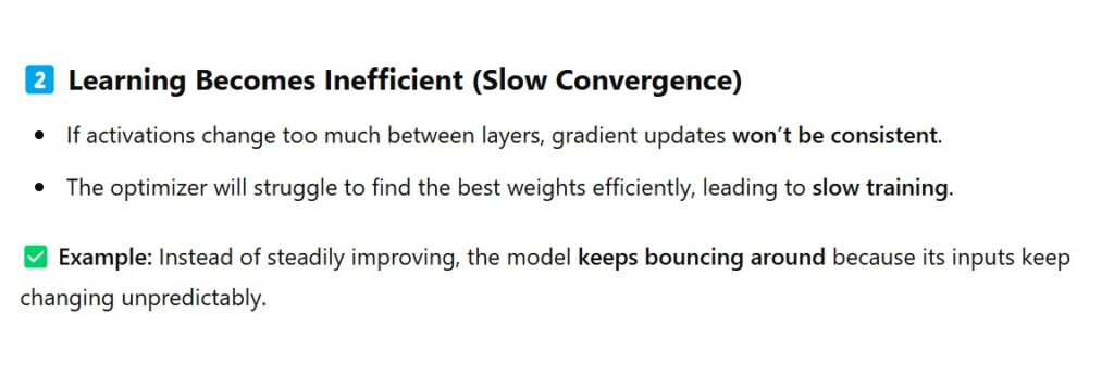- If at every batch your input to the each layer changing frequently , like at batch-1 the input range is from 0 to 10 an in second batch the range has increased to 0 to 100 suddenly , it will be difficult for the deep layers to adopt the weights and biases frequently.