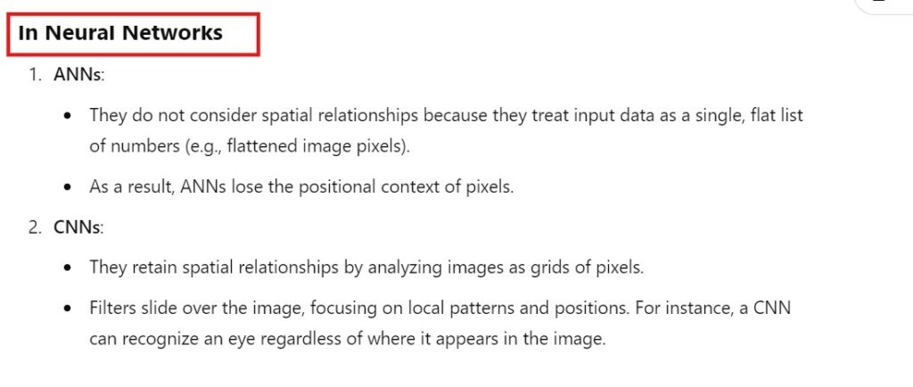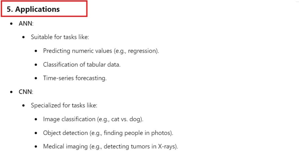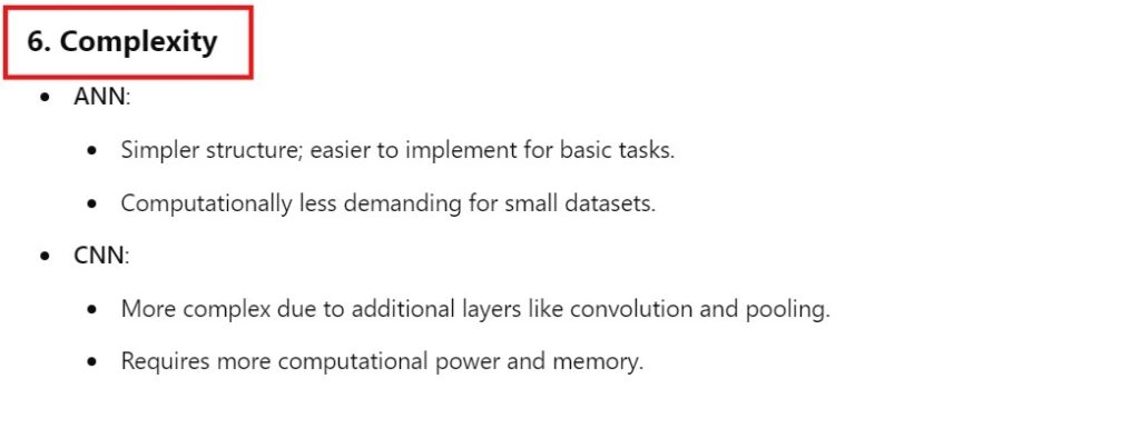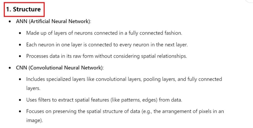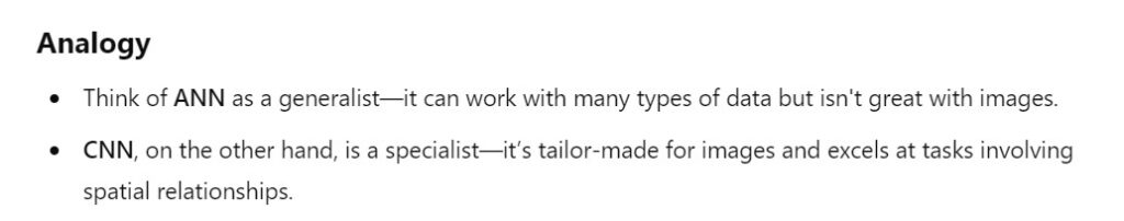 • The main difference between Convolutional Neural Networks (CNNs) and Artificial Neural Networks (ANNs) lies in their structure and the types of tasks they excel at. Here’s a simple breakdown:
