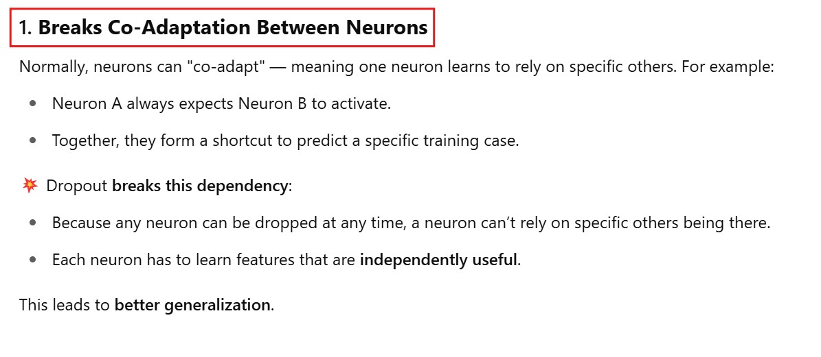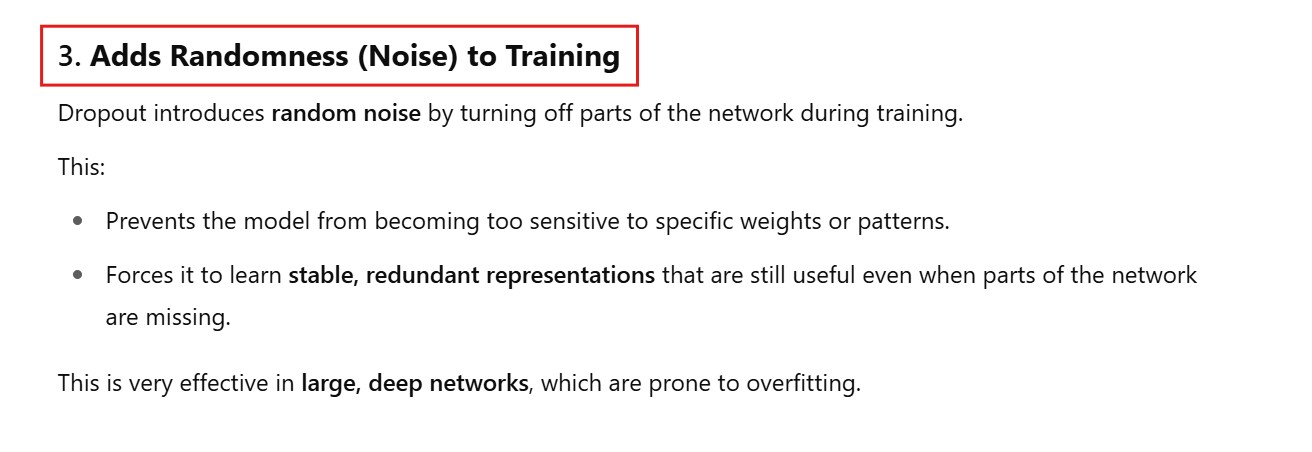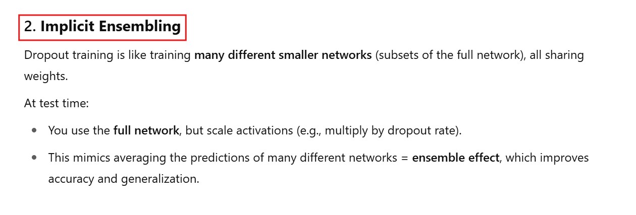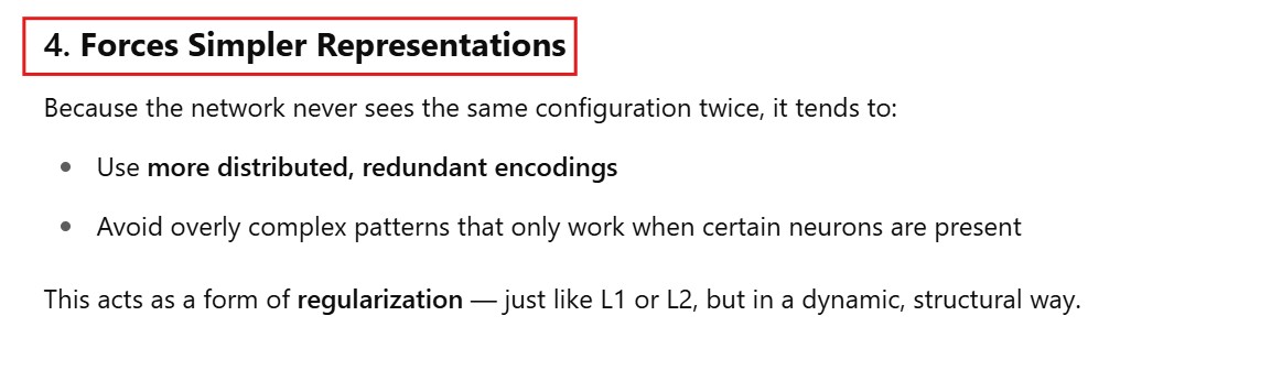 Ensemble Effect: The Dropout Layer can be seen as creating an ensemble of smaller sub-networks within the larger network. During each training iteration, a different set of neurons is dropped out, effectively training a different sub-network. The final model is then an ensemble of these sub-networks, which can lead to improved performance.