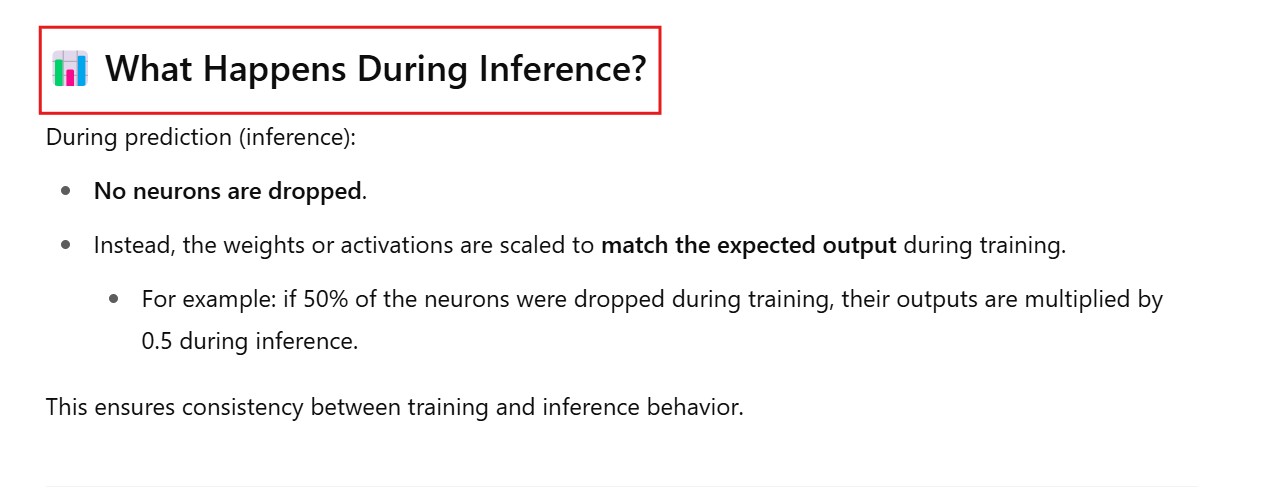No Dropout during Inference: During the inference (or testing) stage, the Dropout Layer is typically disabled, and all the neurons are active. This ensures that the model can make predictions on new, unseen data using the full capacity of the network.