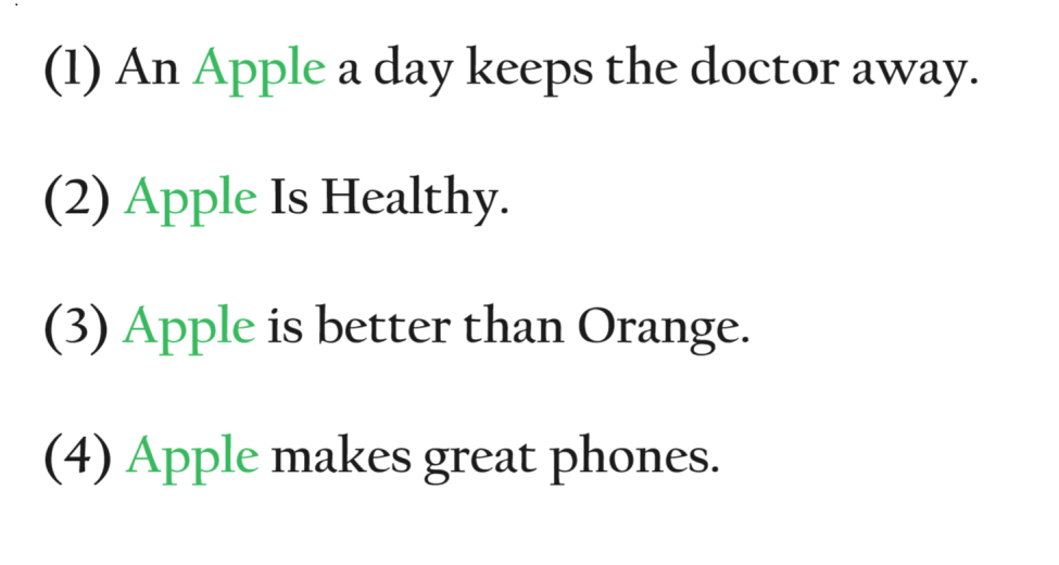 - You can see in the above example ‘Apple’ being used as a fruit most of the time.
