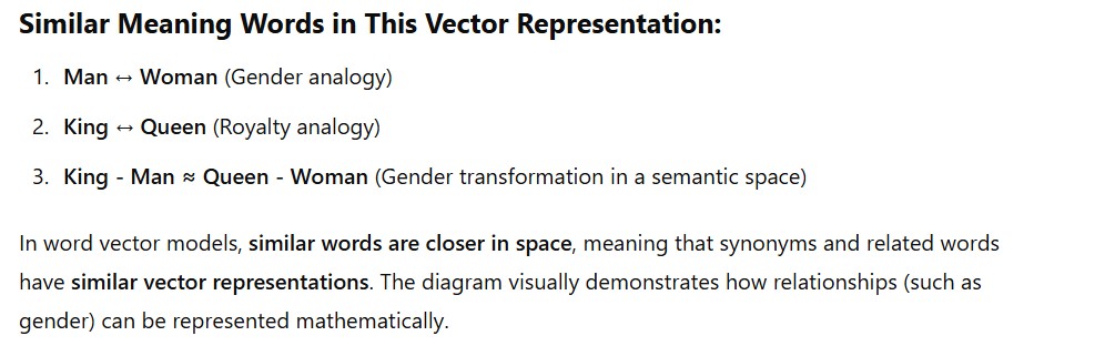 • Ability To Capture Analogies: Word embeddings can capture analogical relationships between words, such as “king” is to “man” as “queen” is to “woman”.