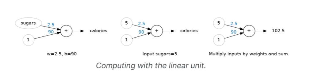 'sugars'(grams of sugars per serving) as input and'calories'(calories per serving) as output, we might find the bias isb=90and the weight isw=2.5. We could estimate the calorie content of a cereal with 5 grams of sugar per serving like this: