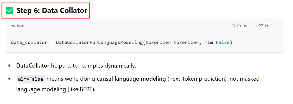 data_collator = DataCollatorForLanguageModeling(tokenizer=tokenizer, mlm=False)