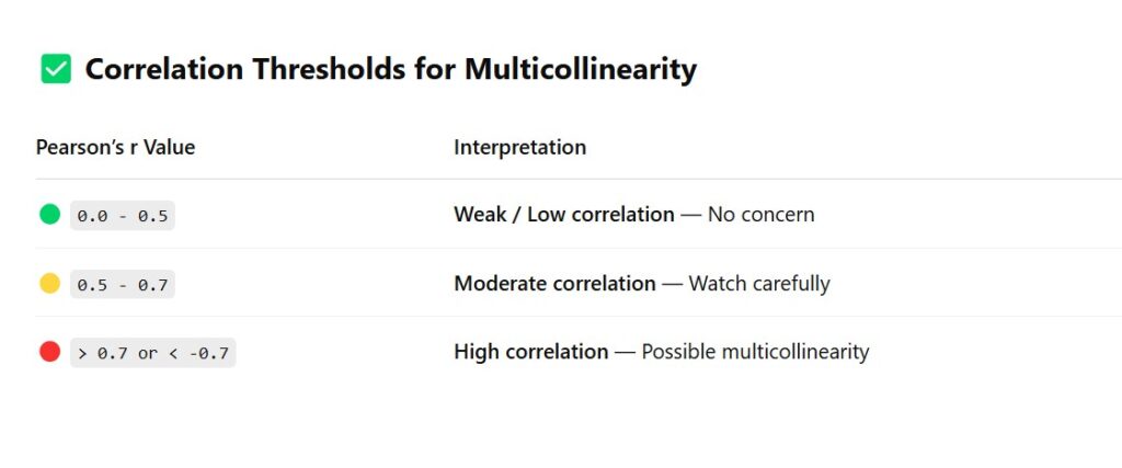 • Best When: Two or more variables have high correlation (Pearson’s r > 0.7 or VIF > 5/10), and you can justify removing one based on domain knowledge.