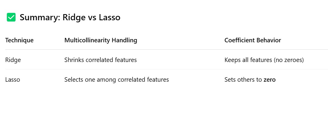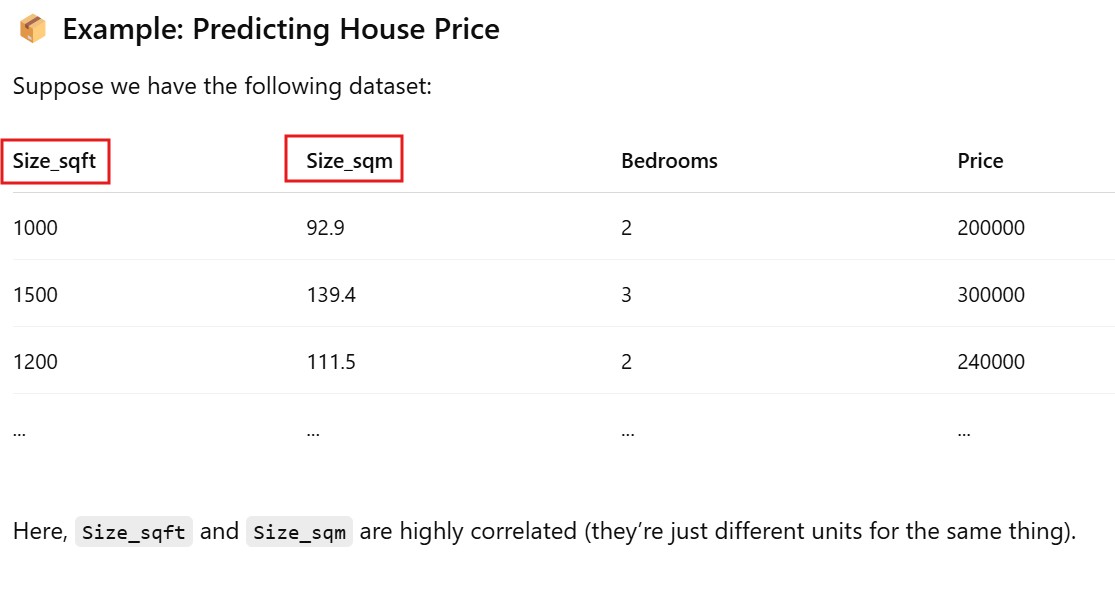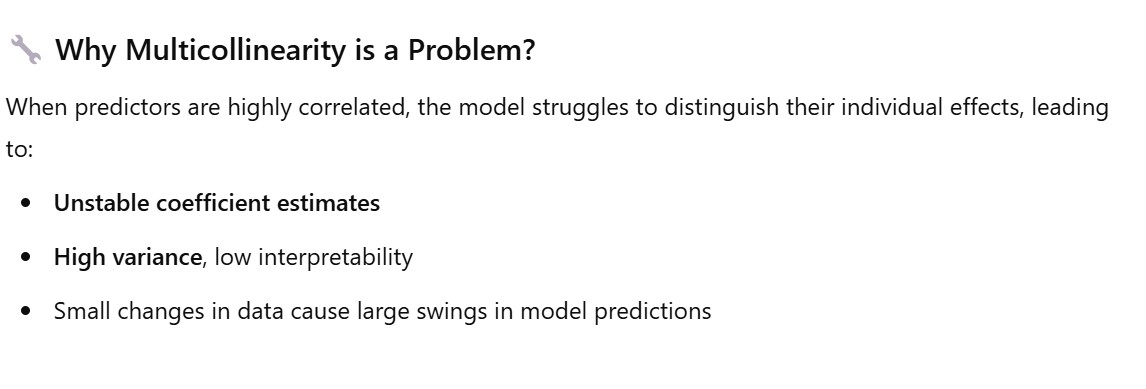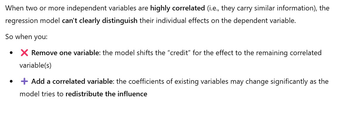 • This causes multicollinearity, and the model starts “splitting the credit” between them in a shaky way.
