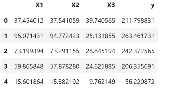df = pd.DataFrame({'X1': X1, 'X2': X2, 'X3': X3, 'y': y})