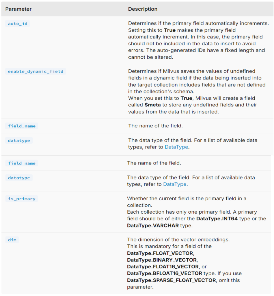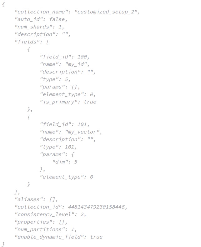 • The collection generated in the above code contains only two fields: id (as the primary key) and vector (as the vector field),