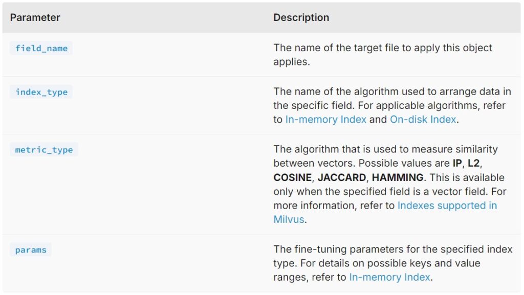 • Index parameters dictate how Milvus organizes your data within a collection.