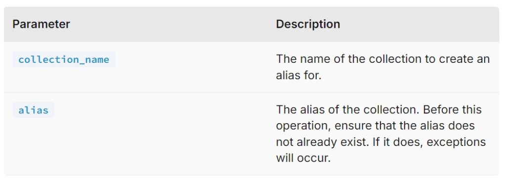 • To create aliases, use the create_alias() method, specifying the collection name and the alias.