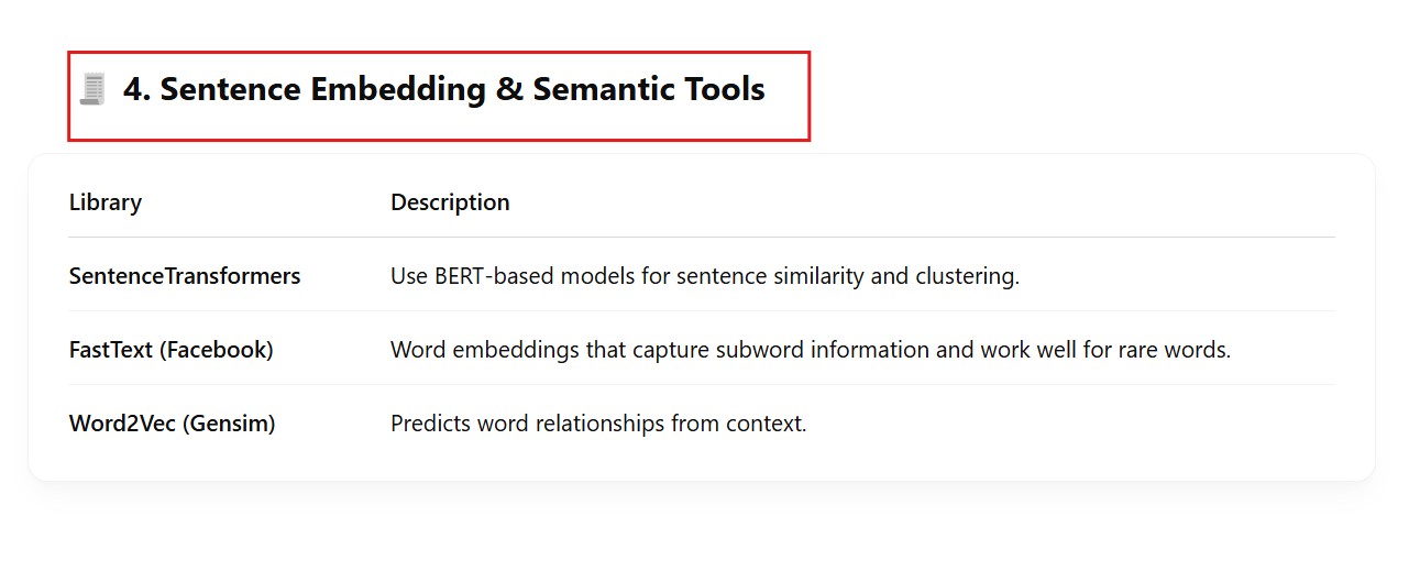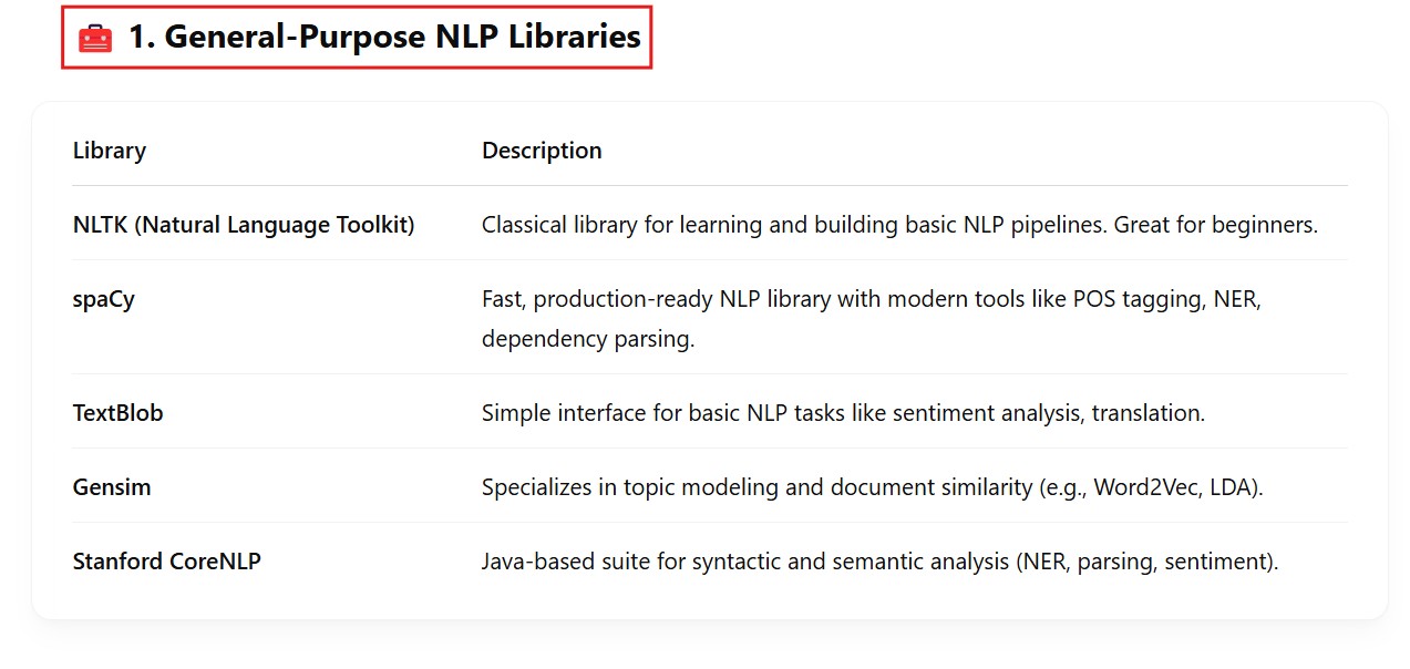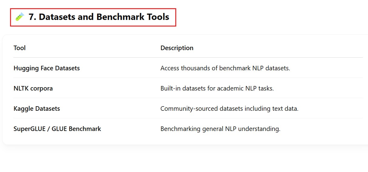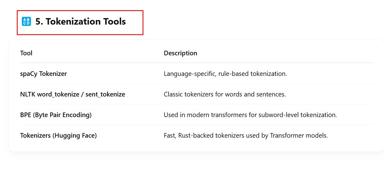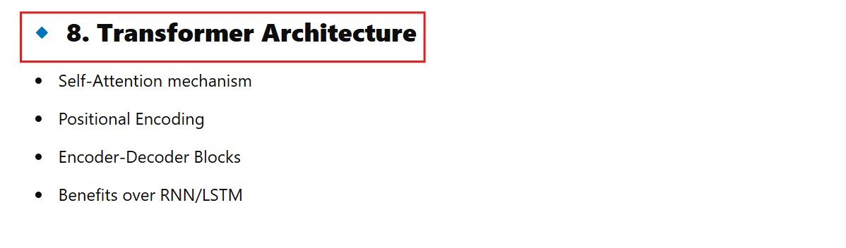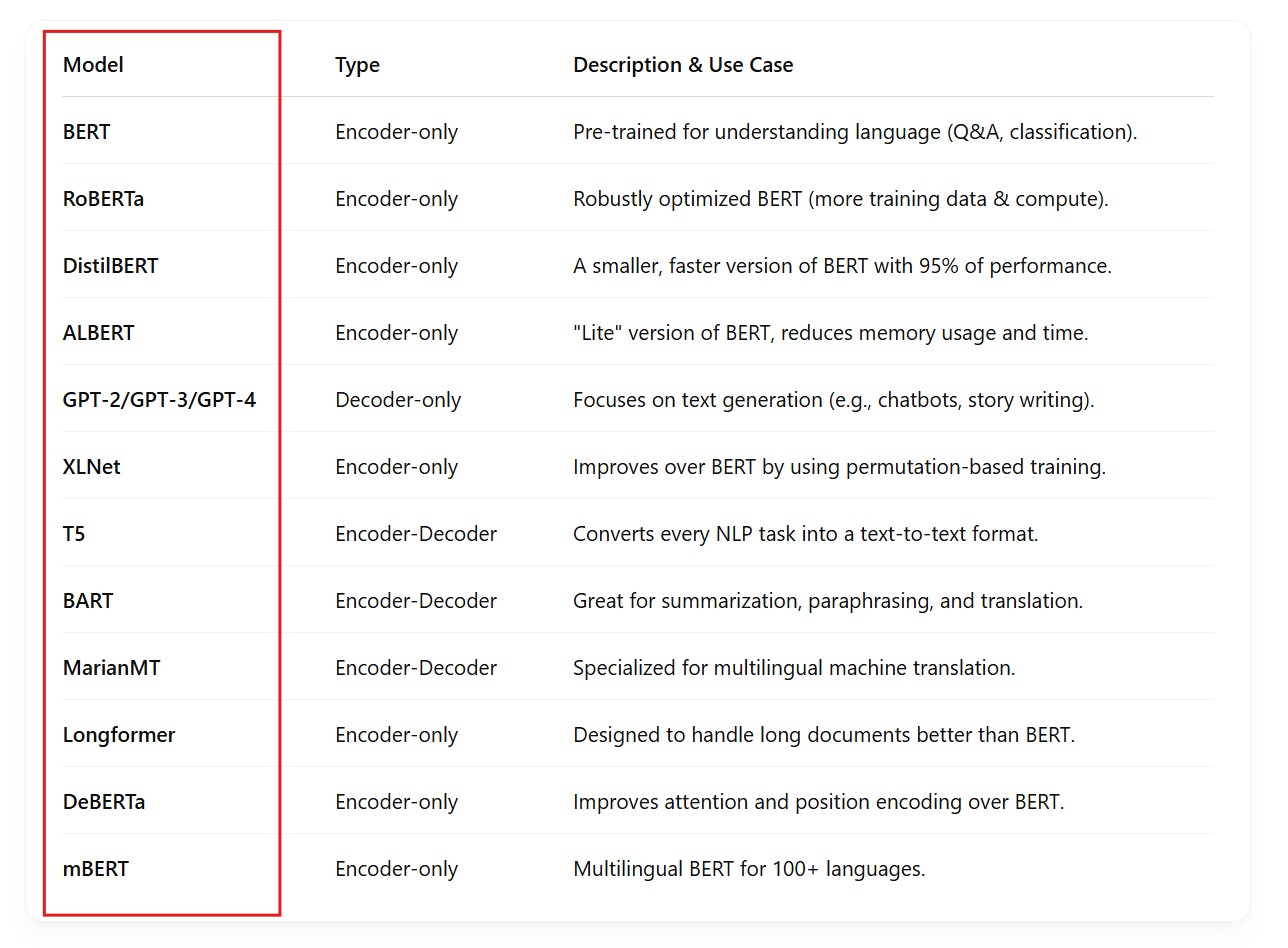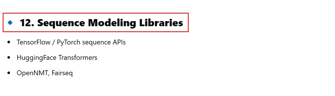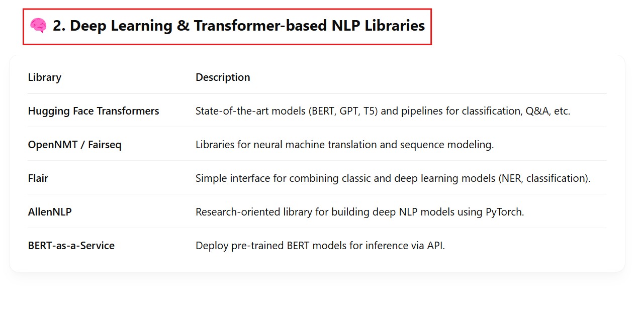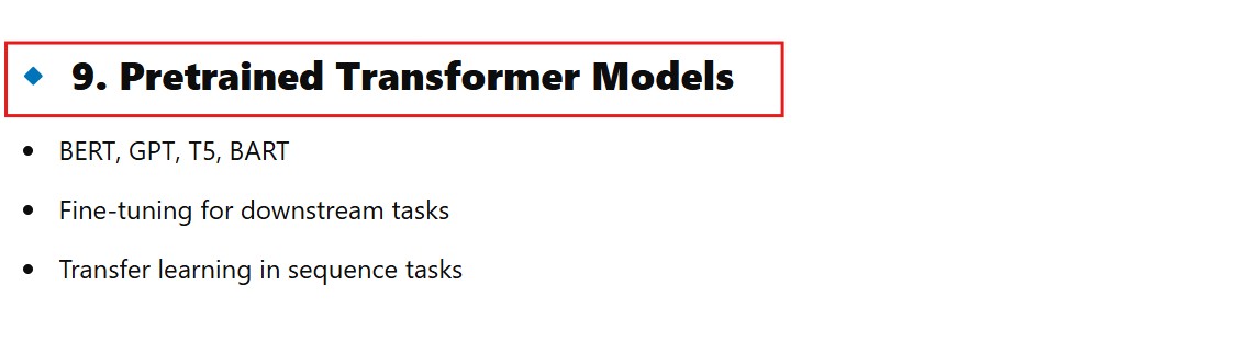 - Hugging Face Transformers (Pretrained models (BERT, GPT, T5, etc.))