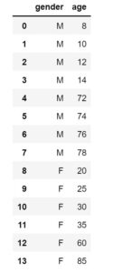 df = pd.DataFrame({"gender": list("MMMMMMMMFFFFFF"), "age": age_list})