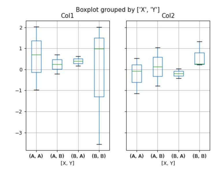 boxplot = df.boxplot(column=['Col1', 'Col2'], by=['X', 'Y'])