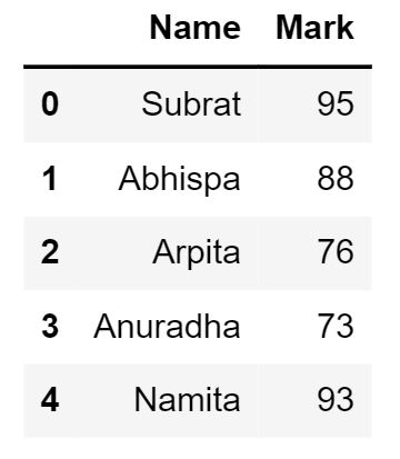 student_object.loc[:,['Name','Mark']] Output: