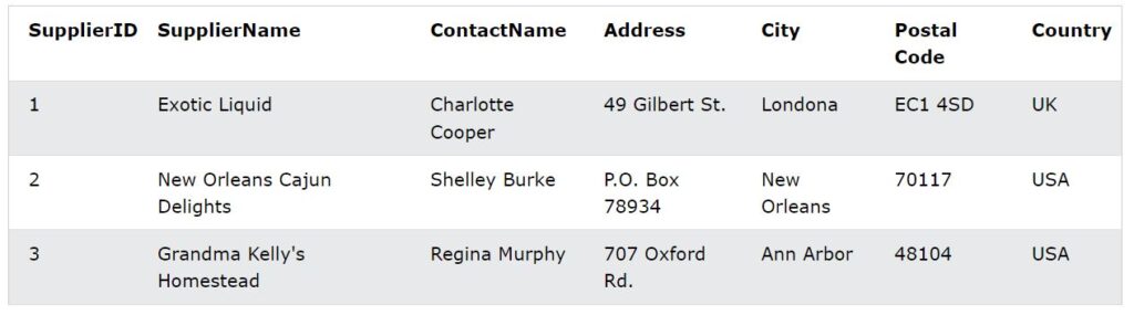 SELECT SupplierName, ContactName, Address, City, PostalCode, Country FROM Suppliers; Example-3: