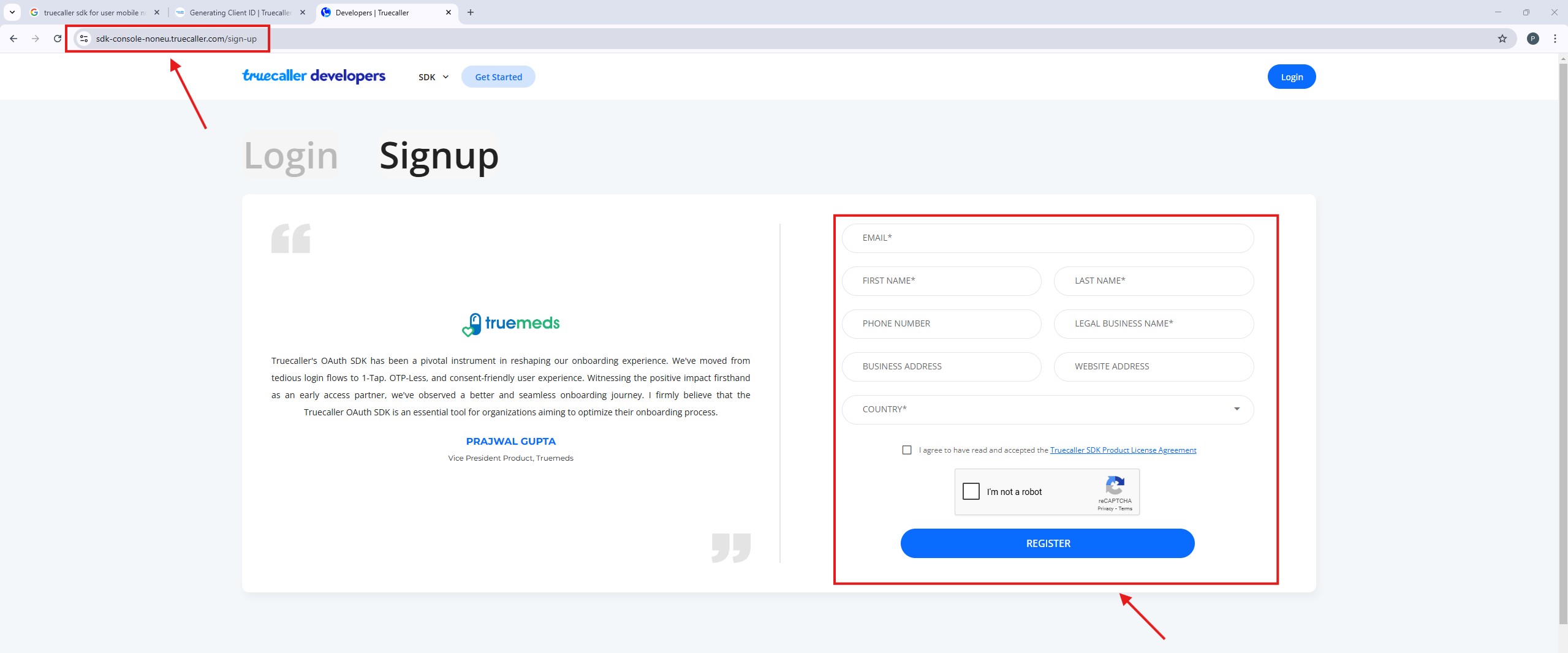 Step-1: Go to https://sdk-console-noneu.truecaller.com/login and register your account.