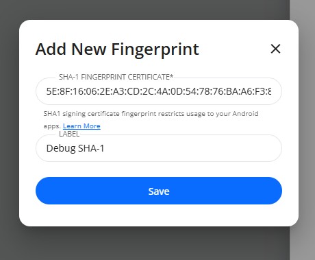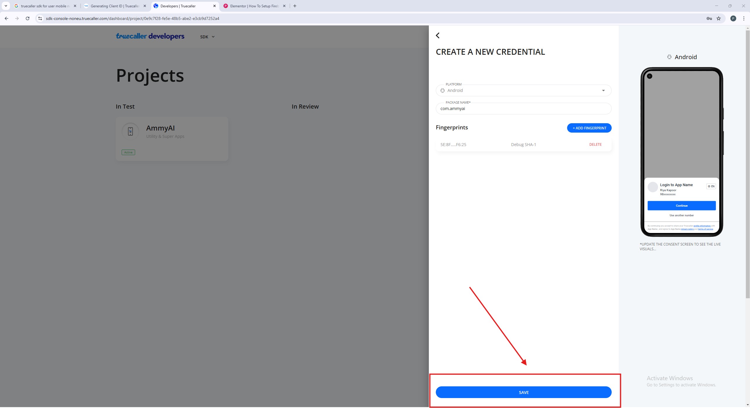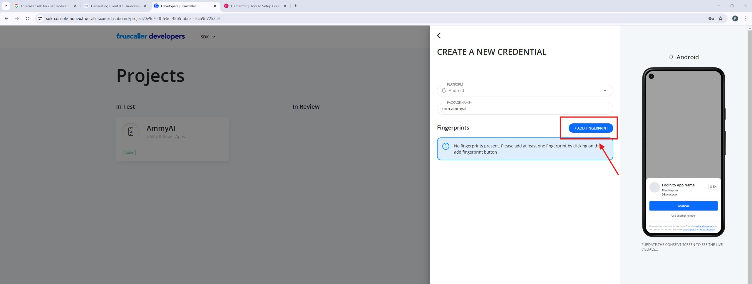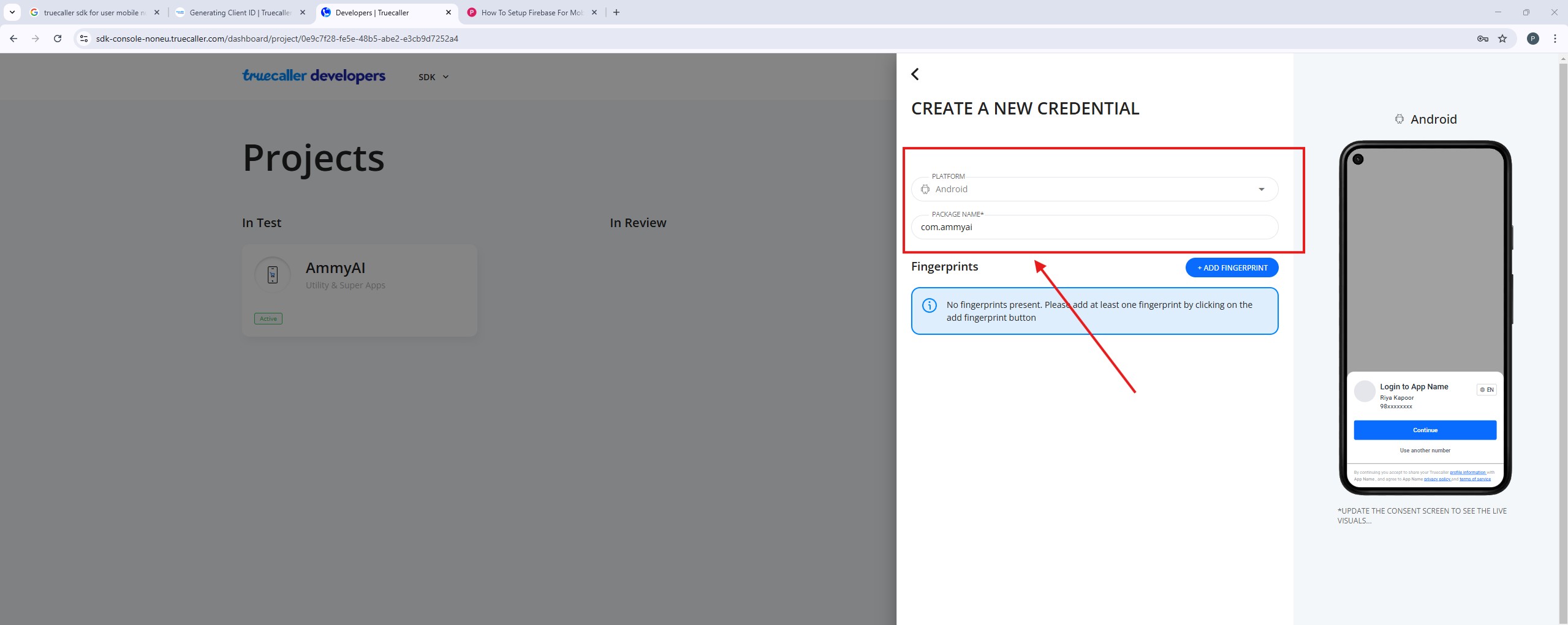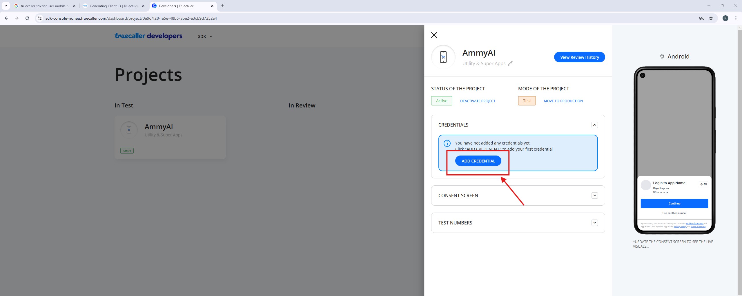 Step-5: On the project screen, click the “add credential” button and select the platform as Android from the dropdown menu.